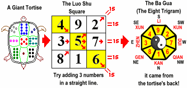 According to ancient Chinese legends, a giant tortoise surfaced from the River Lo in central China around 4,000 years ago. The ancient Chinese found a pattern on a tortoise shell (refer to the extreme left picture above). There were circular dots of numbers on the giant tortoise that were arranged in a three-by-three nine grid pattern on it's shell.