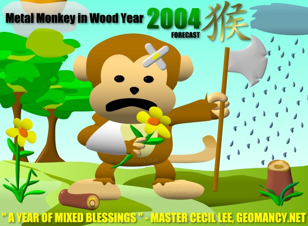 2004 is the Year of Monkey, where the Heavenly Stem of the Year is Wood while Earthly branch is Metal. When Metal Monkey attempts to chop tress, the monkey has both gains and injuries. So some difficulties can be expected.